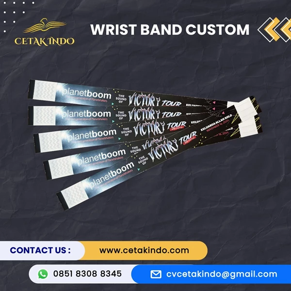 Wrist band custom dengan logo dan desain event membantu peserta mengingat brand atau acara.
